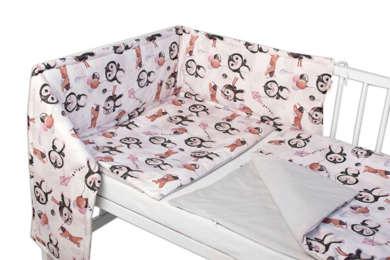 120×90 – obliečky na perinku 120x90cm, obliečky na vankúšik 40×60 cm, mantinel 60x60x60cm – na postieľku 120x60cm.