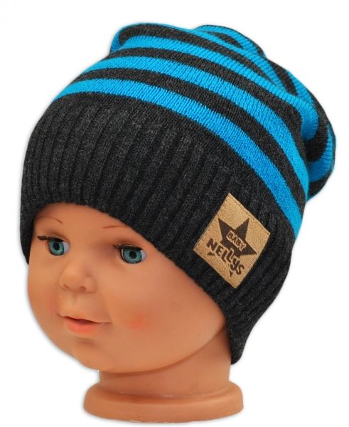BABY NELLYS Jesenná/zimní prúžkovaná čiapka – grafit/tyrkys