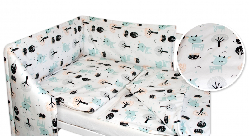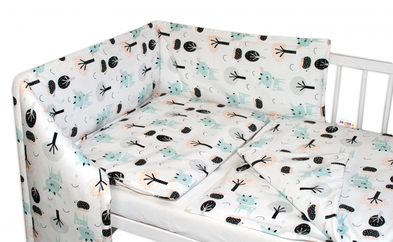 120×90 – obliečky na perinku 120x90cm, obliečky na vankúšik 40×60 cm, mantinel 60x60x60cm – na postieľku 120x60cm.
