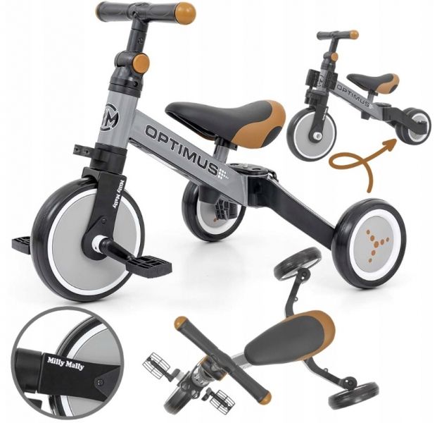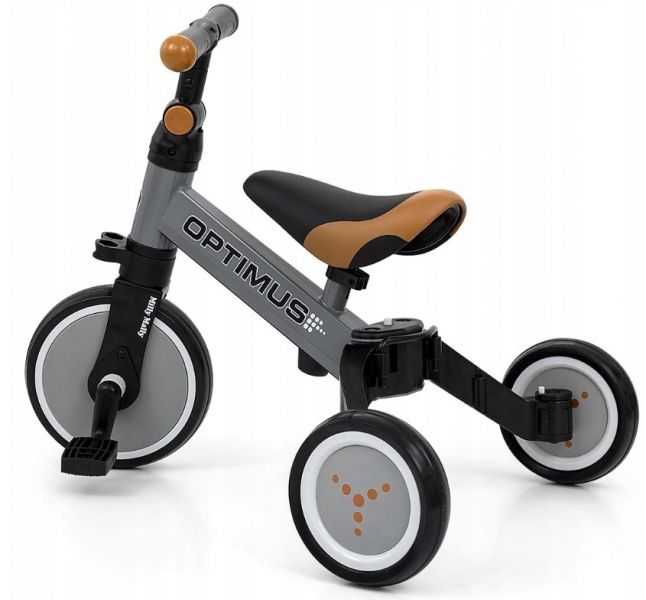 Optimus je navrhnutý tak, aby bol jednou z najlepších volieb pre prvé vozidlo vášho dieťaťa. Vďaka stabilnej trojkolesovej konštrukcii poskytuje dieťaťu patričnú mieru bezpečia a uľahčuje získavanie nových zručností. Keď dieťa zvládne základy jazdy, môžeme pridať pedále alebo z neho urobiť klasický balančný bicykel. Bicykel bol vyrobený z vysoko kvalitných materiálov. Penové kolesá uľahčujú jazdu pri zachovaní dostatočného pohodlia. Nastaviteľná výška sedla umožňuje prispôsobiť koleso výške dieťaťa.