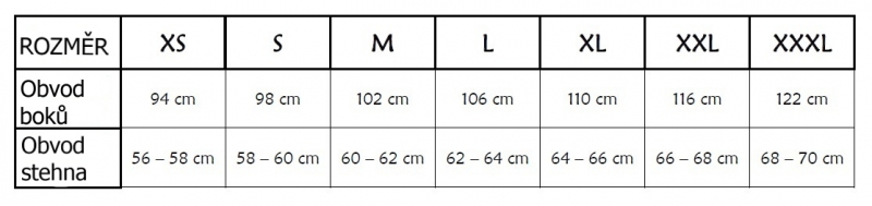 Rozmery: pozri tabuľku, dĺžka nohavíc cca 15 cm.