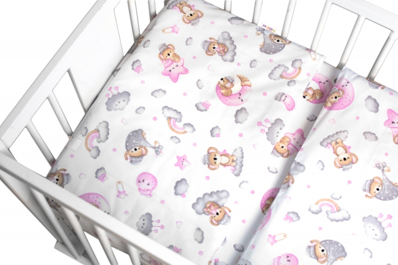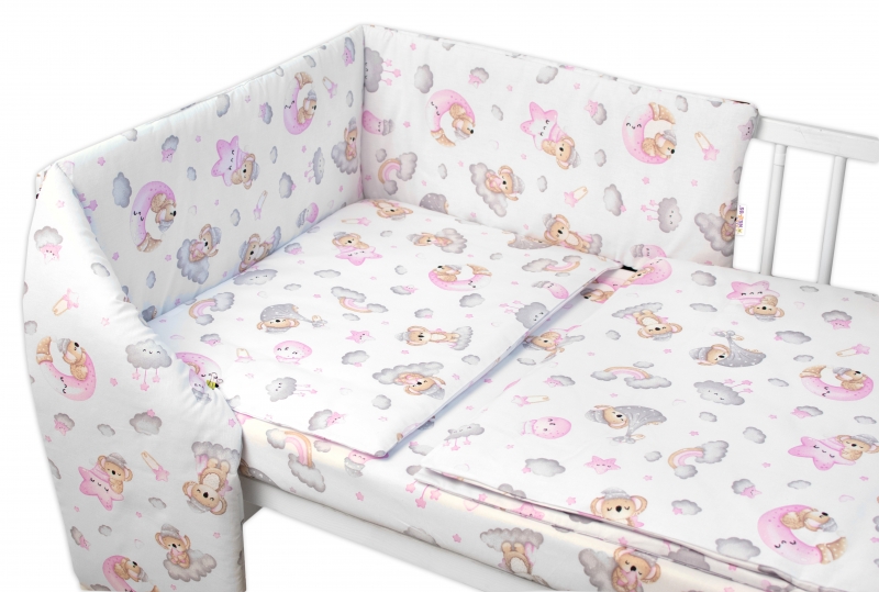 120×90 – obliečky na perinku 120x90cm, obliečky na vankúšik 40×60 cm, mantinel 60x60x60cm – na postieľku 120x60cm.