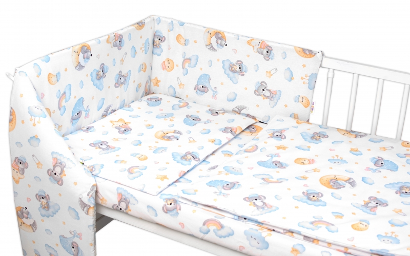 120×90 – obliečky na perinku 120x90cm, obliečky na vankúšik 40×60 cm, mantinel 60x60x60cm – na postieľku 120x60cm.