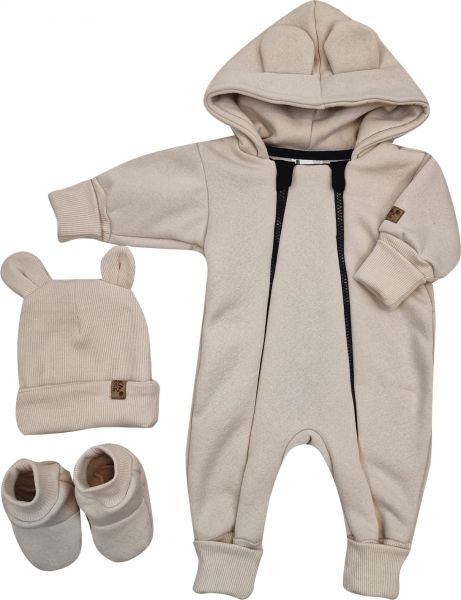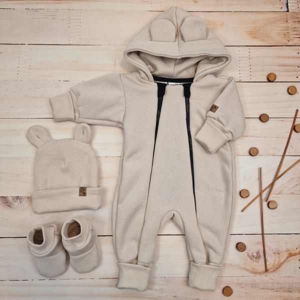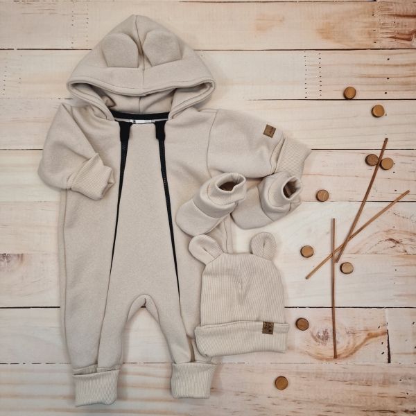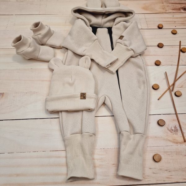Materiál: Overálok (medvedík na vnútornej strane) 95% bavlna 5% elastan, rebrovaná čiapka: 95% bavlna 5% elastan, Topánočky: 95% bavlna, 5% elastan.