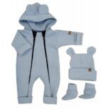 Materiál: Overálok (medvedík na vnútornej strane) 95% bavlna 5% elastan, rebrovaná čiapka: 95% bavlna 5% elastan, Topánočky: 95% bavlna, 5% elastan.
