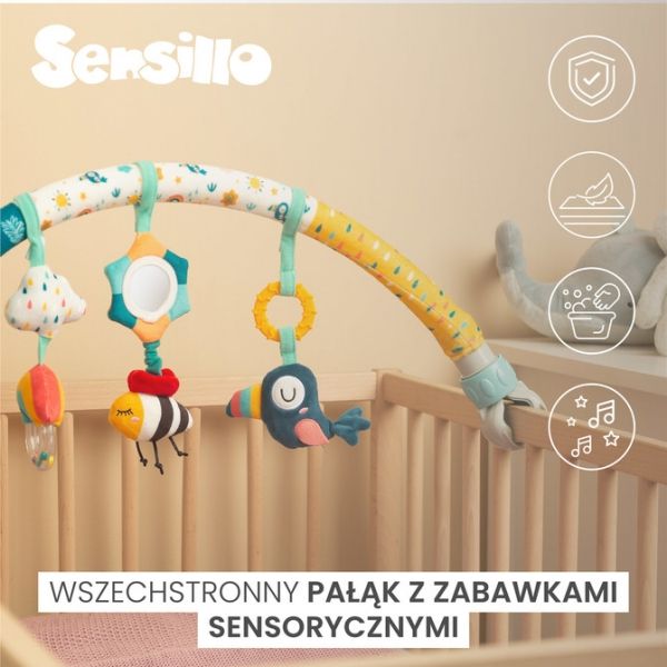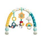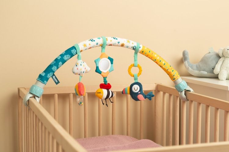 Hrazdička je vybavená rôznymi senzorickými hračkami, ako sú hrkálky, zrkadlo alebo mäkké textúry,