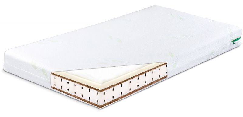 4-vrstvová konštrukcia: 2 cm pamäťovej peny, 2×1 cm kokosové dosky, 6 cm PUR pena, mäkké rúno.