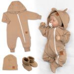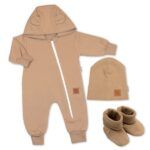 3 dielna sada: Okrem overalu sada obsahuje aj štýlovú čiapočku a topánky/ponožtičky pre nechodiace deti, ktoré udržia nožičky