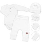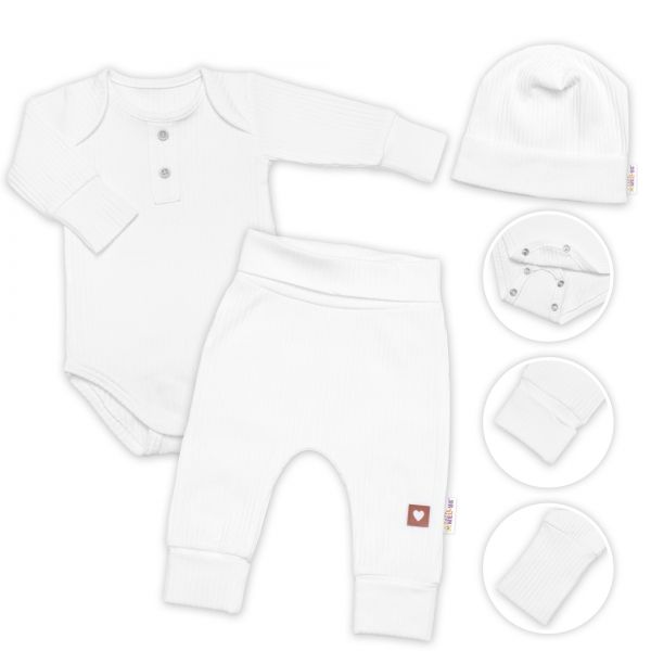 Rebrovaná rastúca sada z mäkkej bavlny predstavuje ideálnu voľbu pre bábätko. Body s dlhými rukávmi ponúkajú možnosť prispôsobenia dĺžky pomocou dvoch radov cvokov v rozkroku. Tepláčiky sú vybavené širokým vyhrňovacím pásom a dlhými nápletmi na nohavičkách. Vďaka týmto nápletom sa tepláčiky jednoducho prispôsobia rastu vášho dieťatka.