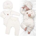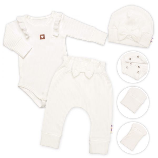 Rebrovaná rastúca sada z mäkkej bavlny predstavuje ideálnu voľbu pre bábätko. Body s dlhými rukávmi ponúkajú možnosť prispôsobenia dĺžky pomocou dvoch radov cvokov v rozkroku. Tepláčiky sú vybavené širokým vyhrňovacím pásom a dlhými nápletmi na nohavičkách. Vďaka týmto nápletom sa tepláčiky jednoducho prispôsobia rastu vášho dieťatka.