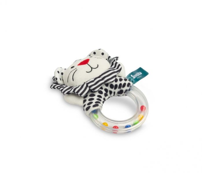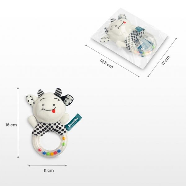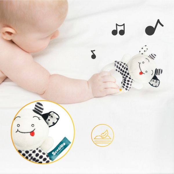 Senzorická hrkálka v kontrastných odtieňoch čiernej a bielej bola vytvorená s ohľadom na stimuláciu zraku a rozvoj zmyslového vnímania vášho bábätka.
