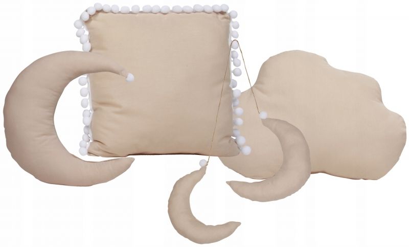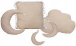 3. 5 roztomilých plyšových vankúšikov – 3 mesiačiky, obláčik, štvorec zdobený brmbolcami. Výplň tvoria mäkké antialergické silikónové guličky.