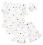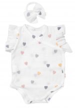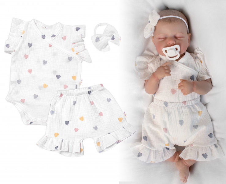 Mušelínové zavinovacie body zdobené volánikmi + kraťasky + čelenka.
