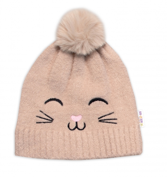 Zimná čiapka s brmbolcom + šál, Kitty, Baby Nellys – cappuccino, veľ. 54/58