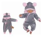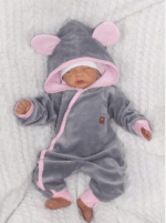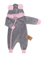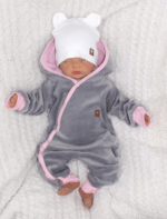 Z&Z Velúrový dojčenský overal s kapucňou a uškami – šedo,růžový, veľ. 68