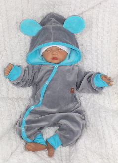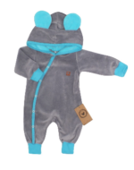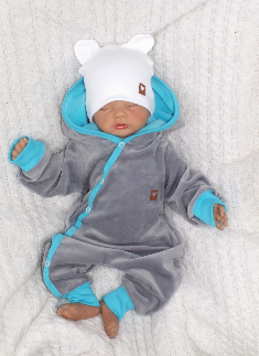 Z&Z Velúrový dojčenský overal s kapucňou a uškami – tyrkysovo, šedý, veľ. 80