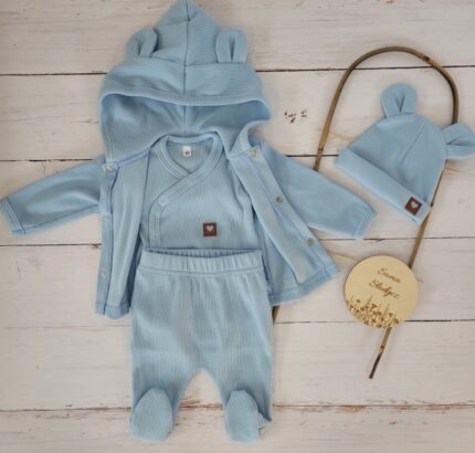 Sada do pôrodnice 4D, rebrovaná, body, polodupačky, kabátik a čiapočka, modrá