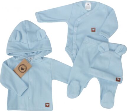Sada do pôrodnice 5D, body, polodupačky, kabátik, čiapočka, rukavičky – modrá