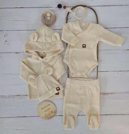 Sada do pôrodnice 5D, body, polodupačky, kabátik, čiapočka, rukavičky – ecru