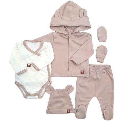 Sada do pôrodnice 5D, body, polodupačky, kabátik, čiapočka, rukavičky, béžová, veľ. 62