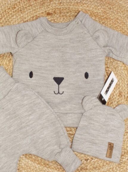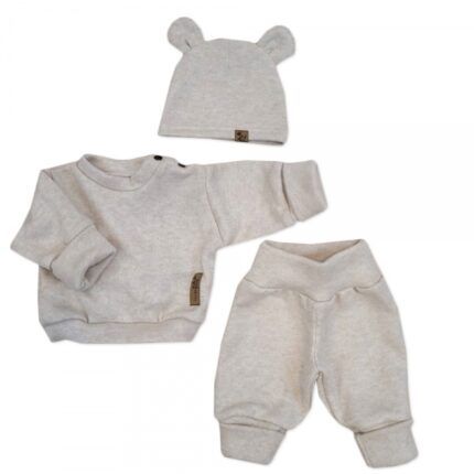 Pletená dojčenská sada 3D Medvedík, svetrík, tepláčiky + čiapočka Kazum, béžová