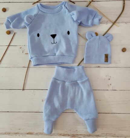 Pletená dojčenská sada 3D Medvedík, svetrík, tepláčiky + čiapočka Kazum, modrá, veľ. 62