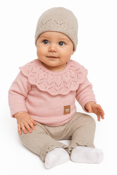 Pletená dojčenská sada 3D, svetrík, tepláčiky + čiapočka Kazum, piesková