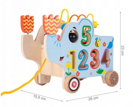 Tulimi Edukačný drevený slon s kolieskami, labyrintom a číslami